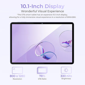 The OT6 smart tablet has an expansive 10.1-inch display, allowing for a fully immersive visual experience in a resolution of 800x1280.