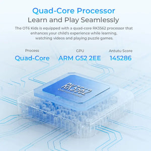 The OT6 Kids is equipped with a quad-core Processor that enhances your child's experience while learning, watching videos and playing puzzle games.