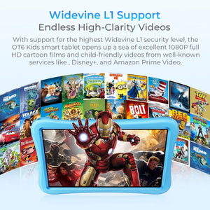 With support for the highest Widevine L1 security level, the OT6 Kids smart tablet opens up a sea of excellent 1080P full HD cartoon films and child-friendly videos from well-known services like, Disney+, and Amazon Prime Video.