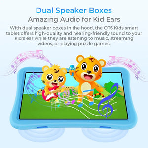 With dual speaker boxes in the hood, the OT6 Kids smart tablet offers high-quality and hearing-friendly sound to your kid's ears while they are listening to music, streaming videos, or playing puzzle games.