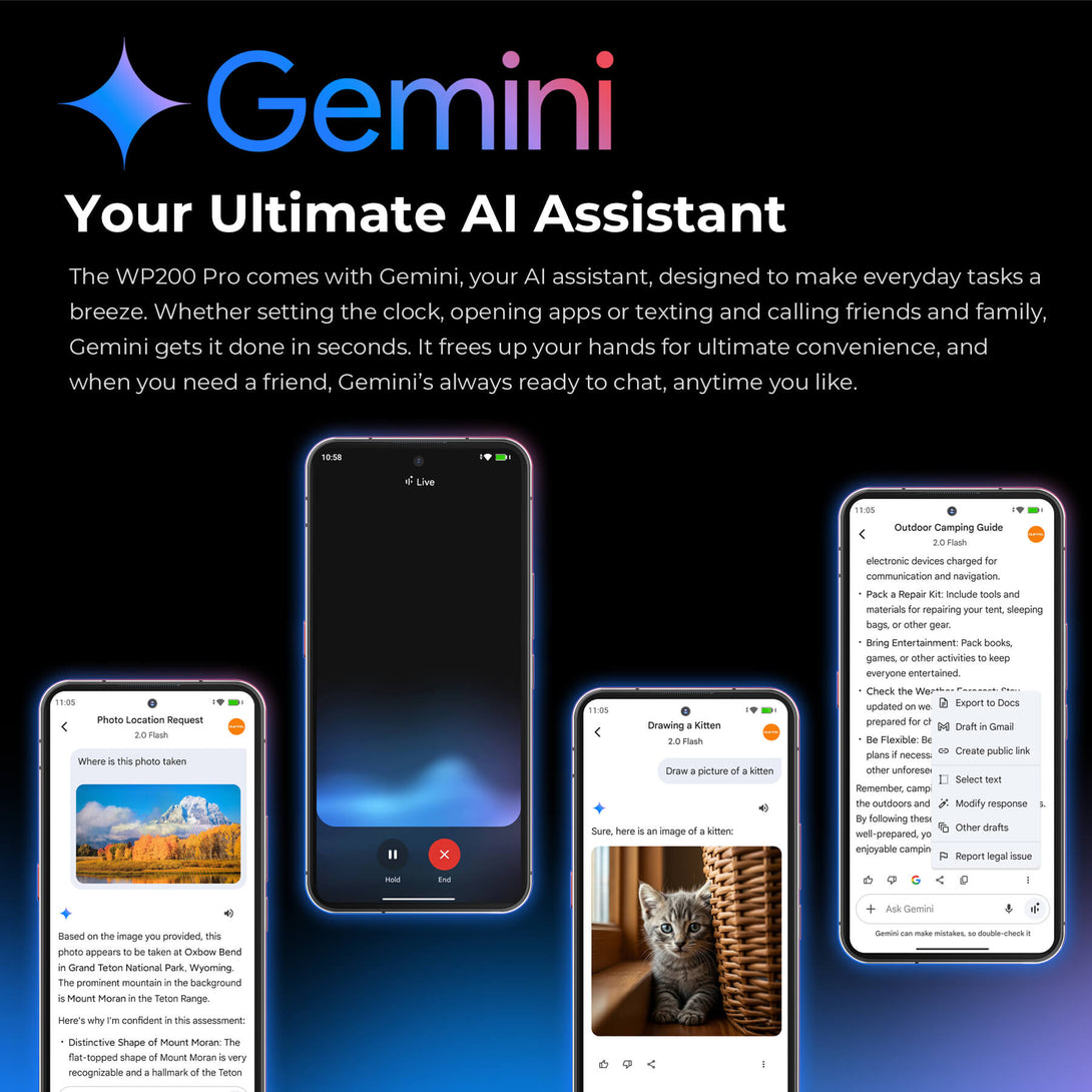 The WP200 Pro comes with Gemini, your AI assistant, designed to make everyday tasks a breeze. Whether setting the clock, opening apps or texting and calling friends and family, Gemini gets it done in seconds. It frees up your hands for ultimate convenience, and when you need a friend, Gemini’s always ready to chat, anytime you like.