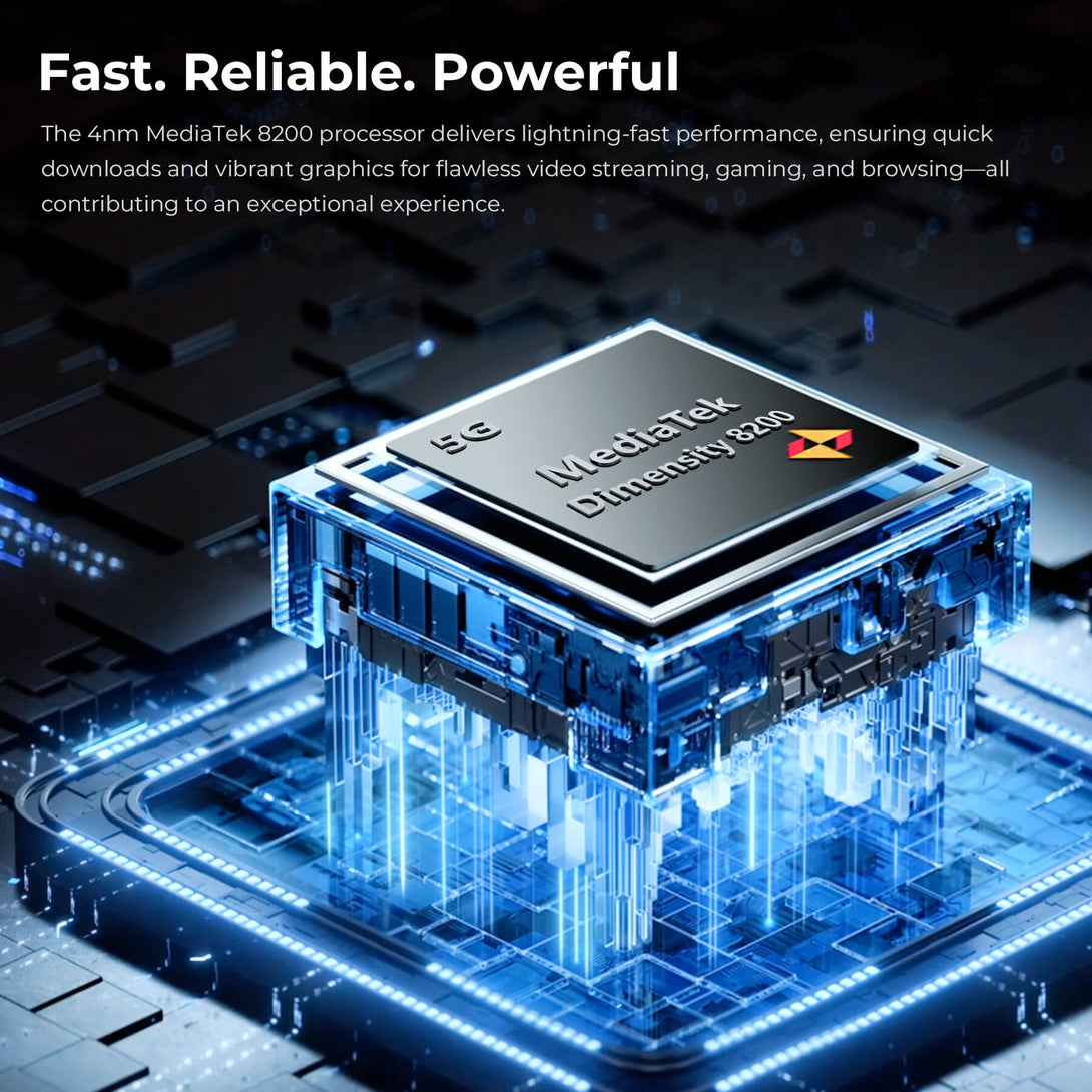 The 4nm MediaTek 8200 processor delivers lightning-fast performance, ensuring quick downloads and vibrant graphics for flawless video streaming, gaming, and browsing—all contributing to an exceptional experience.