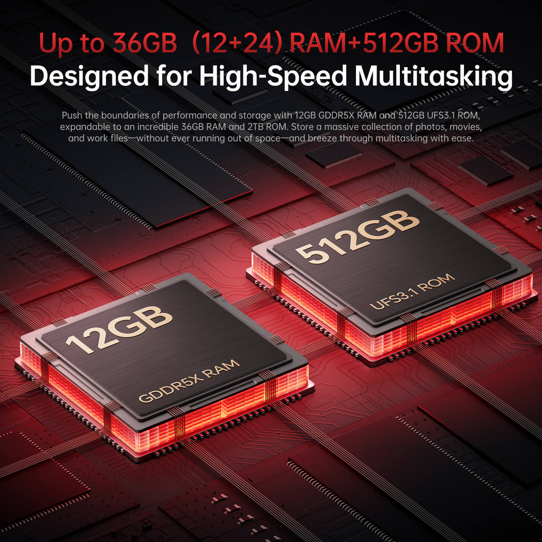 Push the boundaries of performance and storage with 12GB GDDR5X RAM and 512GB UFS3.1 ROM, expandable to an incredible 36GB RAM and 2TB ROM. Store a massive collection of photos, movies, and work files—without ever running out of space—and breeze through multitasking with ease.